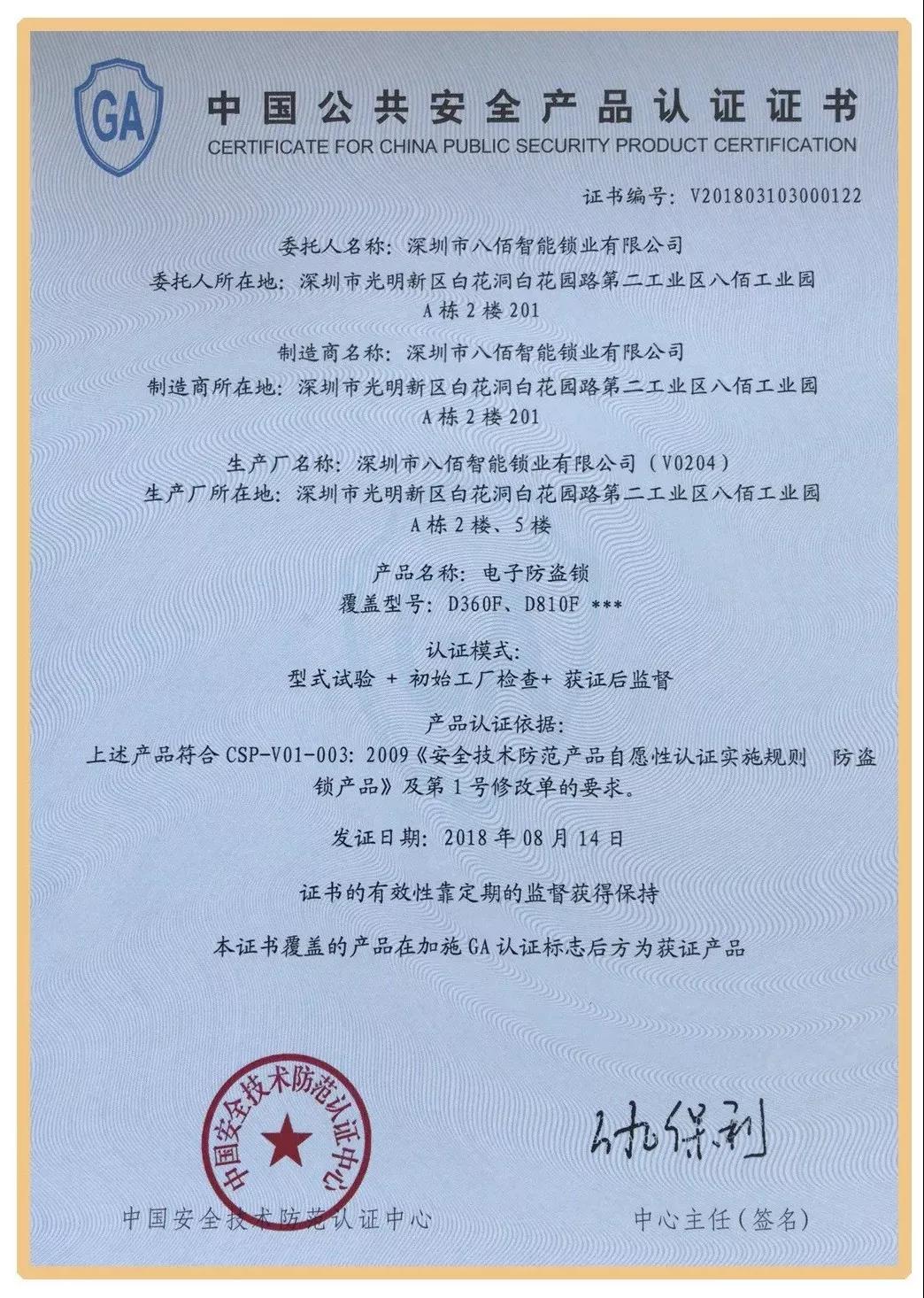 2018年8月14日,八佰智能鎖業(yè)榮獲“中國公共安全產(chǎn)品認(rèn)證證書”,截至目前為止,八佰智能鎖業(yè)為智能鎖行業(yè)第一家獲此證書的企業(yè)!